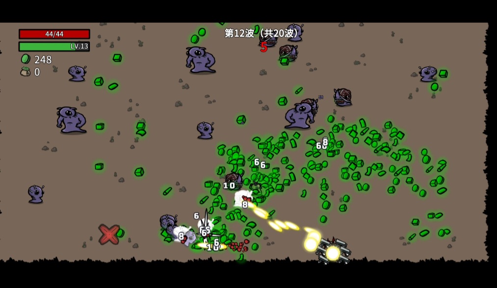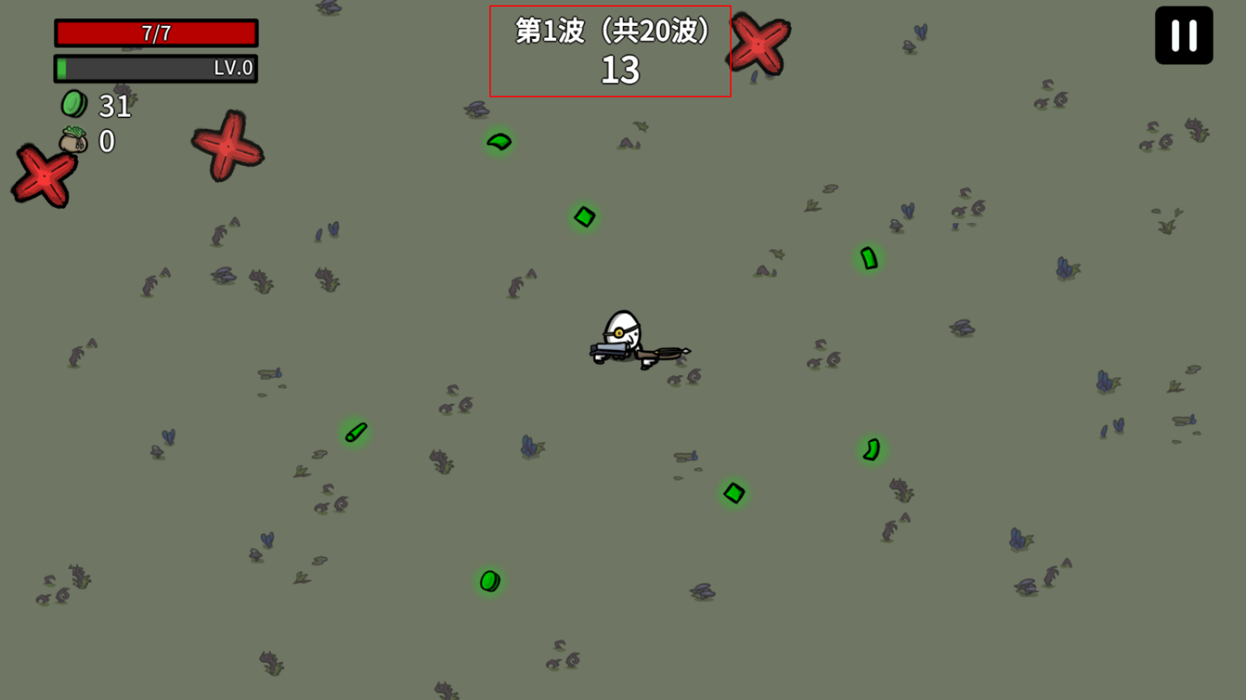 2、通过收集材料快速积累经验,并在每波敌人进攻的间隙,策略性地从商店购买实用道具。