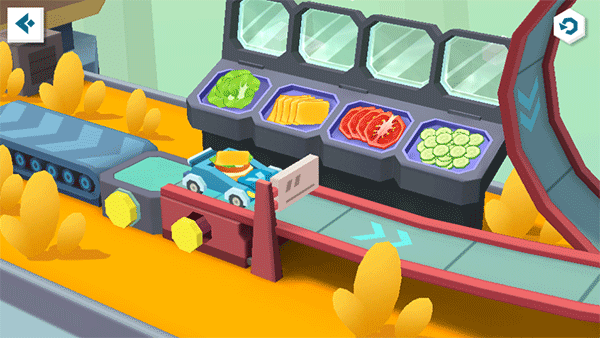 还差最后一步——添加面包盖,美味汉堡就能大功告成!不过还有一个小考验——通过趣味弹球桌:宝宝快启动弹跳格,让汉堡进入弹球桌,翻滚起来!