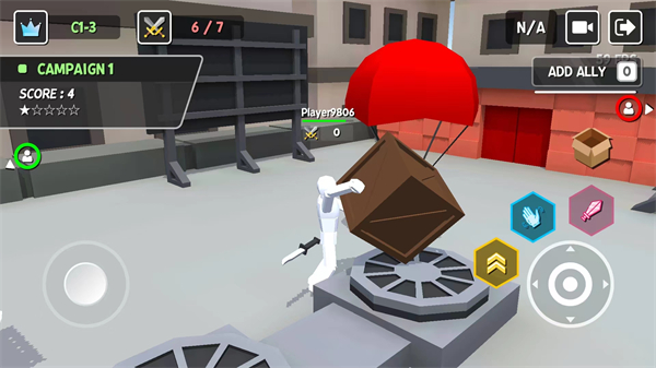 左下角的虚拟摇杆用于控制角色移动。右侧按钮分别对应跳跃、拾取物品和切换武器。操作简单直观,适合快速上手。