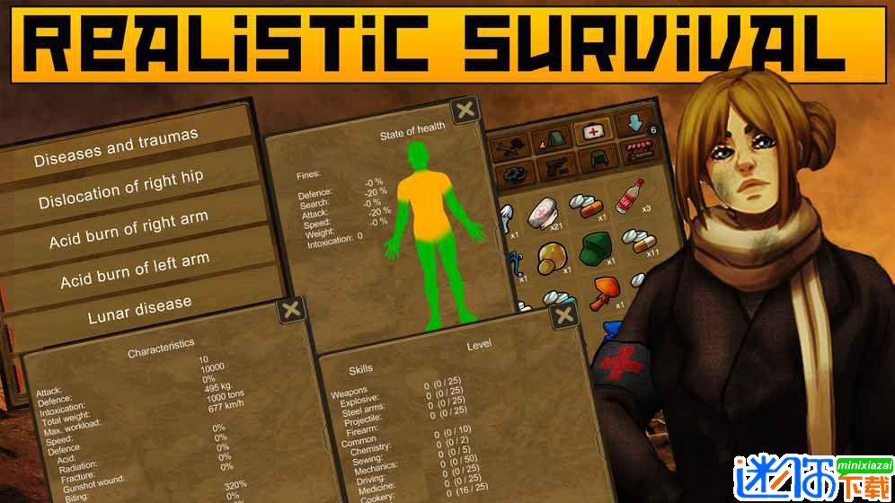 1、玩家需要面对饥饿、僵尸和辐射等生存挑战,并时刻保持警惕;
