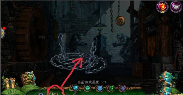 2、点击左边场景【哥布林房间】,点击中间下面的齿轮;在齿轮旁边拿到【铁链】;用【八边形钥匙】打开机关,在地上拿到【镰刀】。