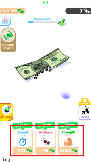 1、首先大家进入小蚁帝国游戏,可以看到蚂蚁需要搬运的物品,也可能是食物,这次小编的是钞票。