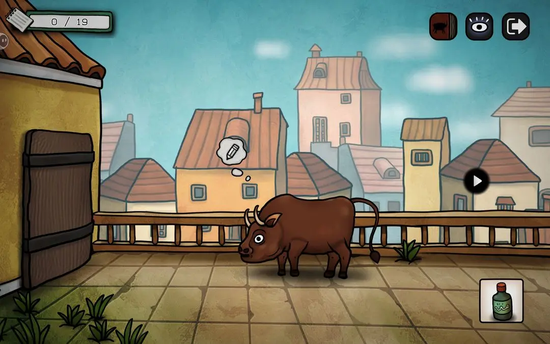 左键,看到阳台上的公牛,把画笔给它,出现铅笔气泡框