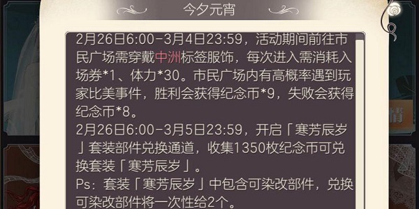 首先,在活动期间要进行比美的比赛,这次的活动地点是在市民广场,入场券需要各位玩家在商城进行购买,值得各位玩家注意的是,要穿着着中洲类型的服装,才可以进入到市民广场。各位玩家点击市民广场,然后与五位玩家进行比美,不论输赢都可以获得纪念币,不过,比美胜利是获得九枚纪念币,输掉比美则是获八枚纪念币。每一次进入市民广场,都需要消耗一定量的入场券和体力。