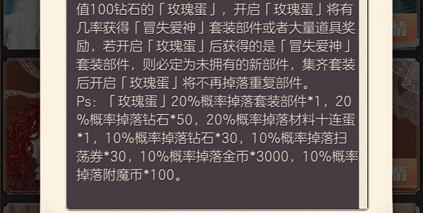 当玩家充值玫瑰蛋之后,如果从中开出套装部件,等下次一再次开出套装部件将不会与上一次的部件重复。保证各位玩家都可以拥有新鲜的游戏体验。并且除了套装冒失爱神之外,还有大量的道具物品奖励不论是用来收集套装还是用来获得道具物品,所以玫瑰蛋对于各位玩家来讲都是很好的获取途径,用钻石购买玫瑰蛋,但是也可以从玫瑰蛋中开启出钻石。这是是一劳永逸的方式。