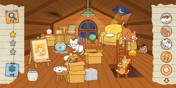 喵侦探咪雅是一款休闲的寻物游戏,玩家需要找到隐藏在画面中的所有猫咪和一些特定的物品,玩法比较简单,不过有些猫咪或者物品隐藏得比较巧妙,需要你绞尽脑汁解开各种谜题才能救出动物,有时甚至需要将手机颠倒才能好找到想要的物品,眼前所看到的不一定是真相,在柜子甚至人物后面有可能会藏匿一只你找不到的小猫猫哦。
