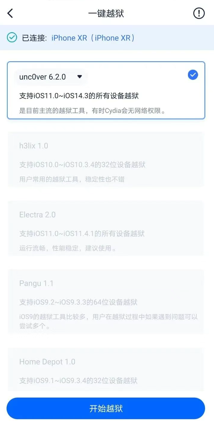 若有当前 iPhone 支持的越狱工具,会在应用界面中自动显示,勾选后点击“开始越狱”并耐心等待越狱工具安装,安装完毕即可在 iPhone 上打开越狱工具运行。