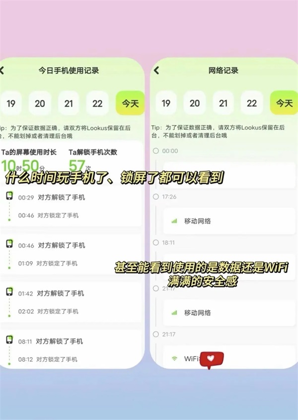 4.全维度手机监控:查看对方解锁/锁屏时间、屏幕使用时长、当前电量(误差10%)、连接WiFi名称/流量状态,防失联神器。