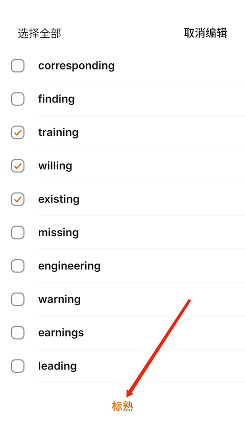 4、勾选需要的单词,然后选择“标熟”选项,