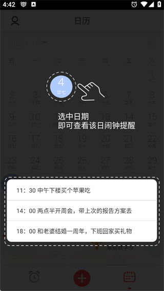 √极简闹钟结合日历功能,按天、周、月查看自己的待办事项,让时间管理更加简单,工作生活井井有条