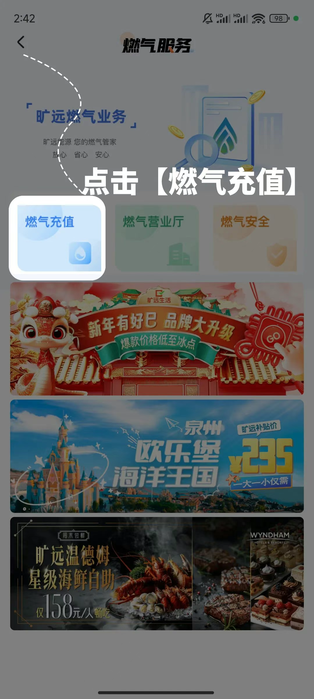 1、打开旷远生活APP,点击首页【燃气业务】,选择【燃气充值】,点击【去充值】