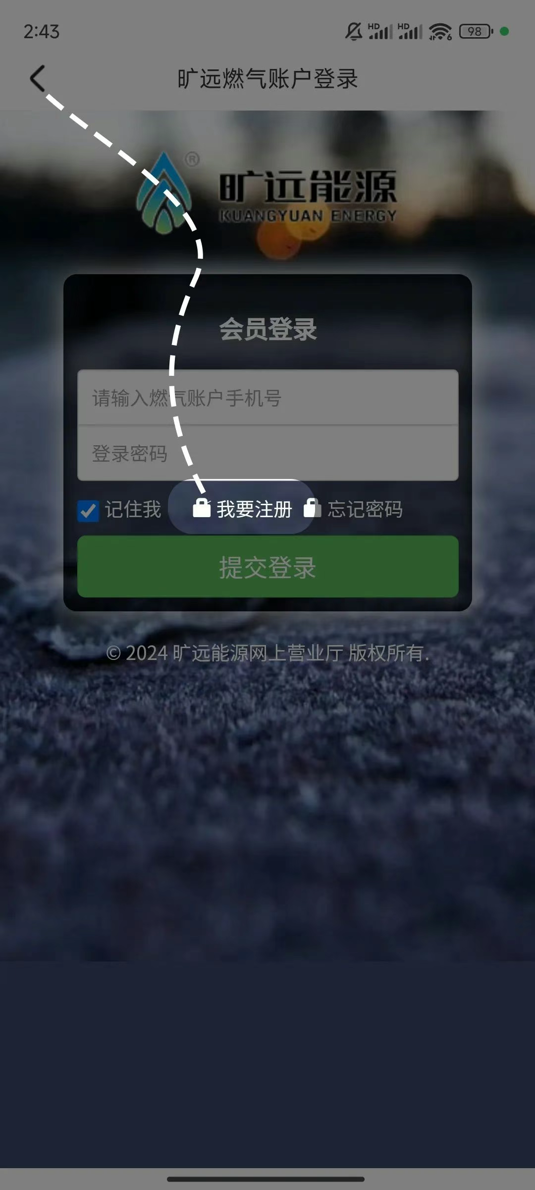 2、若您是第一次进行线上燃气缴费,则需进行账户注册,选择【我要注册】,进行会员注册,注册完成后再进行登录。注:燃气账户手机号为您开通燃气时预留的手机号,若您忘记账户信息,可拨打旷远能源24小时服务热线968188,转人工服务为您查询。