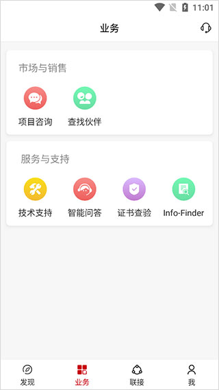 2、业务模块中分为二种功能,市场与销售和服务与支持,用户有需要了解的问题可以通过此功能进行了解。