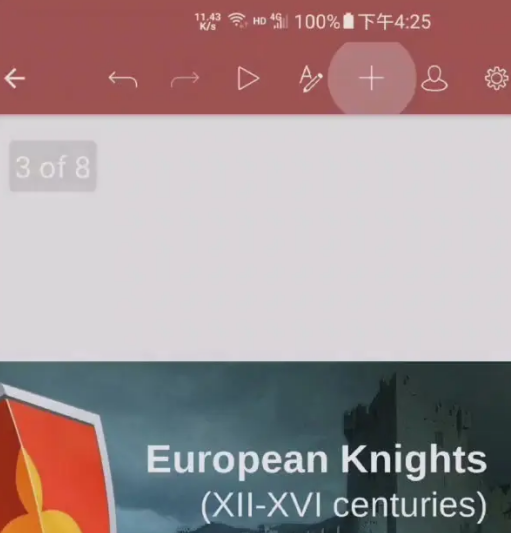 1、onlyoffice手机版增加了新的填充类型:渐变、纹理和图案,比如打开一个幻灯片,点击添加按钮。