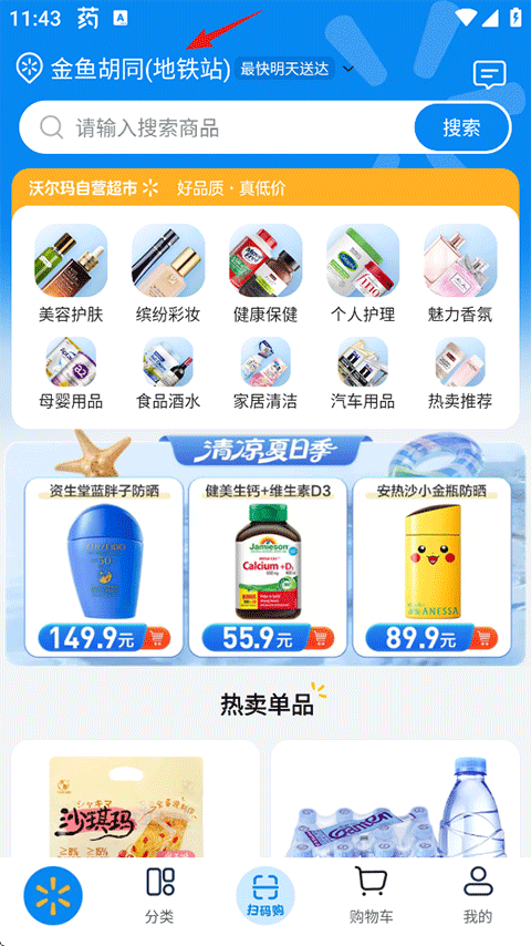 1、打开沃尔玛App网上购物商城,在首页点击左上角的定位进入;