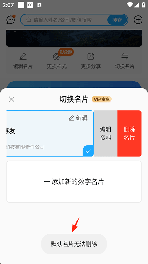 3、需要注意的是作为唯一默认的名片是无法删除的,故需要至少有两张且不是默认名片方可进行删除。