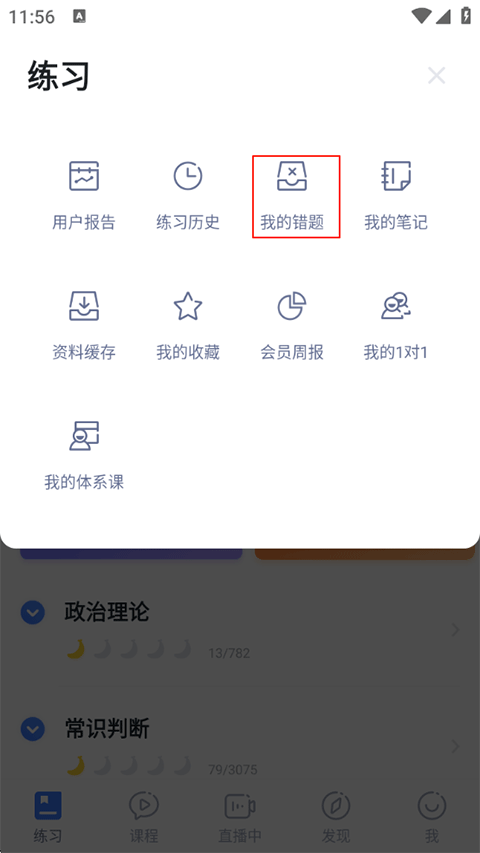2、在弹出的菜单中点击“我的错题”,即可进入 错题本 ;