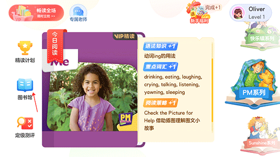 根据孩子自身英语水平,推荐不同阅读路径,其中包括每本绘本的生词预习、核心精读、原版听读、流利跟读及专属练习等等。