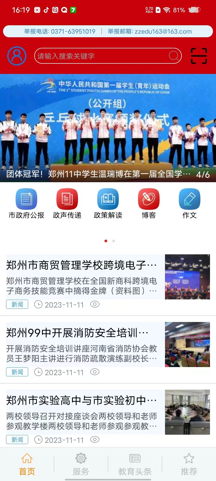 3、在首页,为用户提供了很多有关郑州的 新闻 资讯,包括市政府公报、政声传递、政策解毒,当然还有博客和作文;