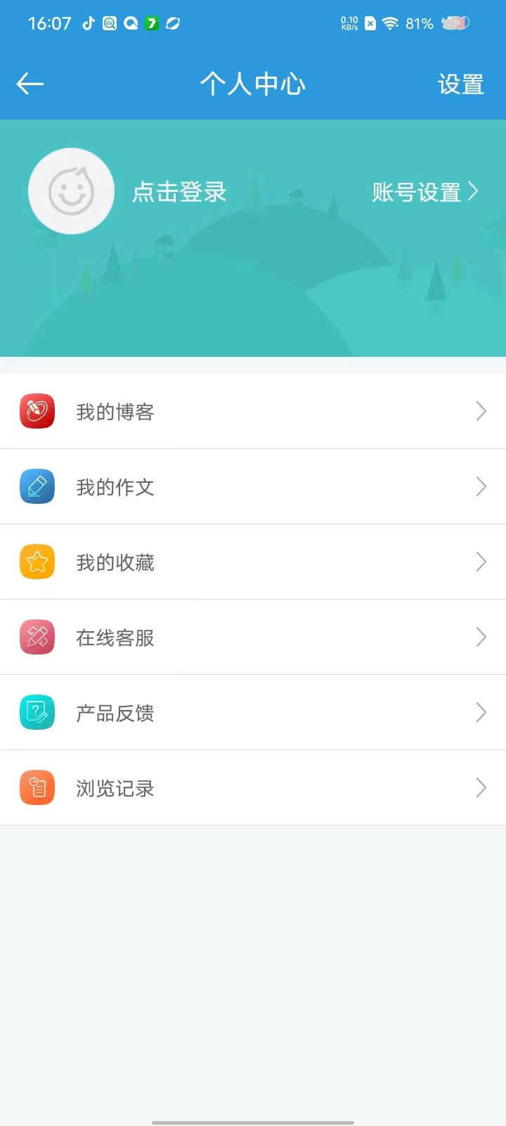2、成功登录以后,可以在个人中心查看我的博客、作文、收藏以及浏览记录等;