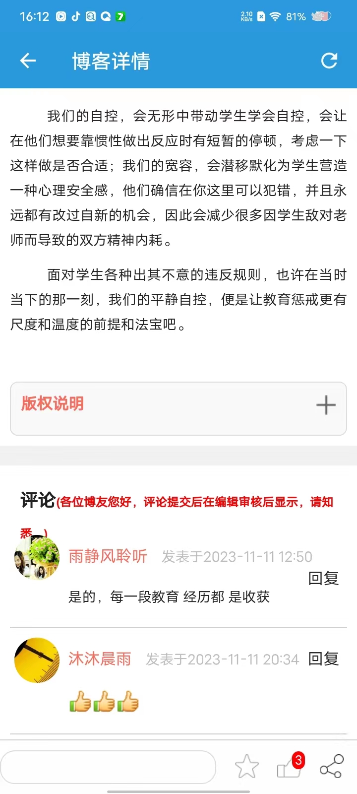 5、点进去以后,往下拉,还可以对此条博客进行评论、点赞、收藏以及分享;