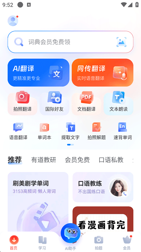 网易有道词典App是一款非常专业的英语词典软件,这款软件为大家收录了海量的单词,支持实时在线翻译、AR翻译、语音翻译等多种模式,丰富的词库用户可以自定义的设置,满足您基本的查词翻译需求。并且这款软件还支持离线功能,无需网络就可以使用,让你随时随地都可以查询单词,相当的方便,软件已涵盖口语、在线课程、单词本等丰富学习内容,如果你也喜欢这款网易有道词典App,那还等什么呢,快来下载试试吧。
