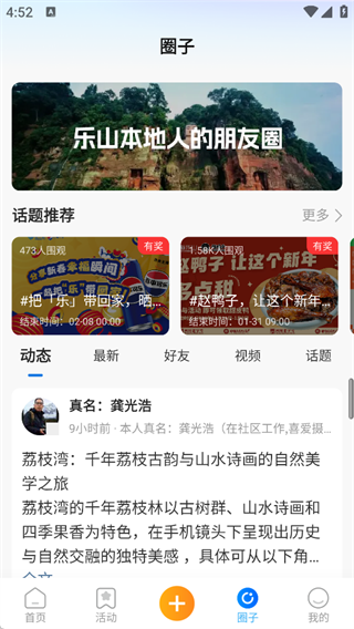 本地人的社交圈,设有话题推荐和动态板块,用户可分享生活、参与话题互动,拓展本地社交。