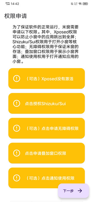 1、打开米窗App首先需要开启一些权限,点击下一步即可去开启。