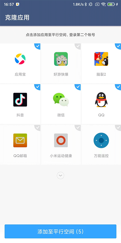 平行空间这款app提供超多实用性质强悍的功能,只需要点击即可为你带来意想不到的惊喜,手机中的所有其他app都可以开始双开,分身根本不占据内存,在有限的手机空间创造出更多的可能,无需注册即可免费使用,成为众多玩机发烧友的最佳选择,不管是游戏还是社交账户等都可以多开挂机,这样的情况下不管是生活还是工作上做什么事都有极高的效率,有需要的用户们快来下载平行空间试试吧。