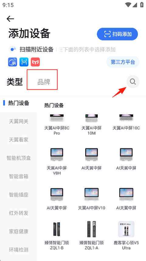 2、在添加设备页以品牌筛选找到您的摄像头,或者点击搜索栏搜索;