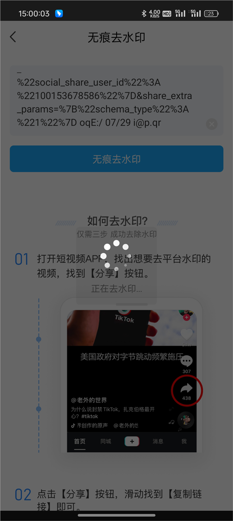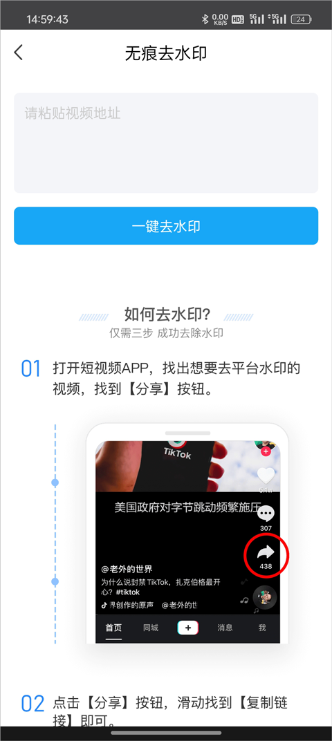 2、前往抖音复制想要去水印的视频链接,并将其粘贴到输入框中。