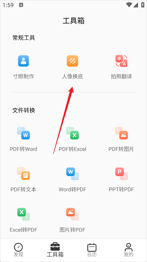 2、在工具箱中选择【人像换底】功能。