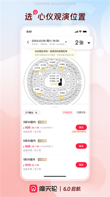 A:摩天轮票务的部分演出提供在线选座,点击“选座购买”可进入选座模式。不提供在线选座的场次,我们将根据您所选票面提供相应的随机座位进行出票。