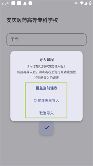 3、导入方式输入学号后,选择【覆盖当前课表、新建课表再导入】。