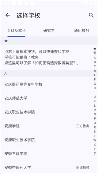 2、选择学校在【选择学校】页面,按分类找到对应学校,确认学校的教务系统类型。