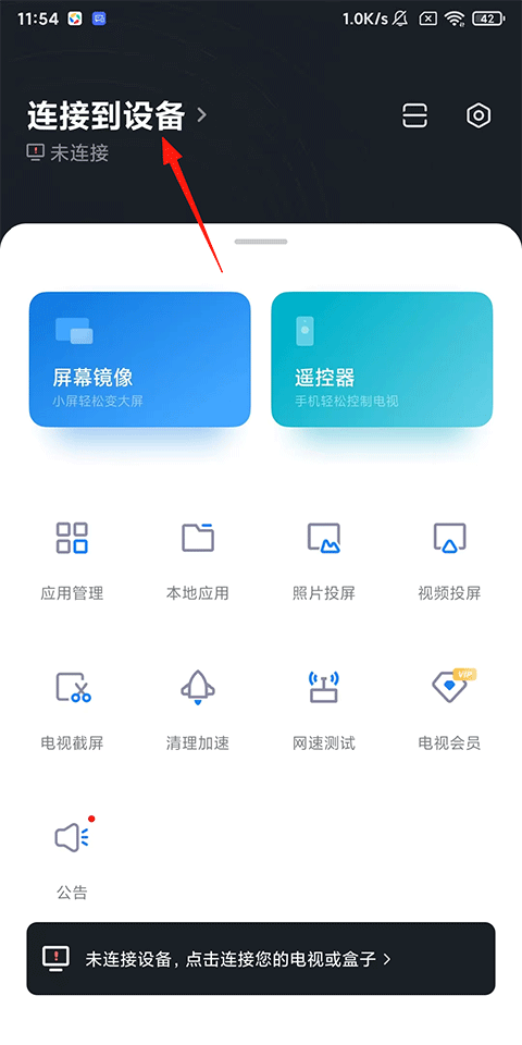 1、打开小米电视助手安卓版APP,在首页点击【连接到设备】;