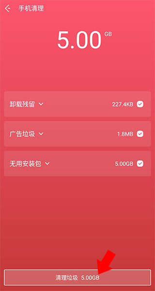 4、扫描完成之后,我们点击下方清理垃圾即可完成对手机内无用文件的清理