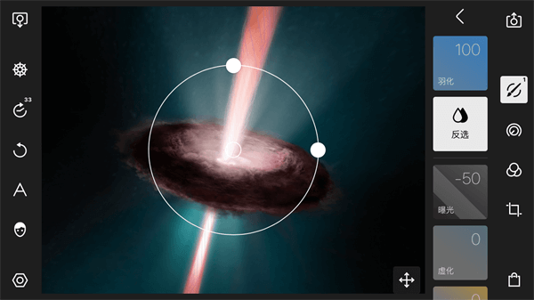 利用圆形调整,我们可以选择性的调整部分画面,从而实现更加精细的调整。当我们新建一个圆形调整之后,画面中会出现一个圆圈,圆圈以外的部分表示受到我们调整参数的影响,圆圈以内的部分表示不受我们调整参数的影响。