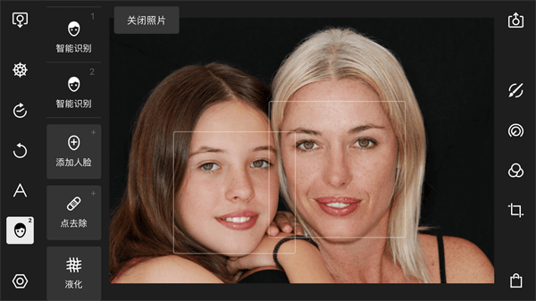 泼辣修图人像面板下,一共包括了智能识别、添加人脸、点去除、液化四个大类。