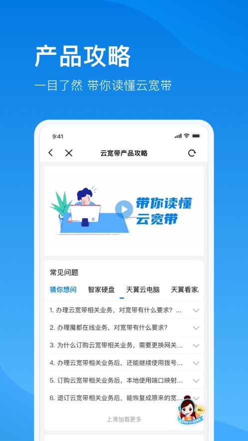 电信云宽带app是一款由中国电信打造的手机app软件,这款软件为大家提供了丰富的功能,你可以在软件中查询账单,宽带办理,宽带升级等各种功能,并且软件中还有专业的客服24小时为你服务,你可以享受到足不出户就办理业务的便捷体验,并且软件中还为大家提供了各种宽带套餐,你还可以在软件中了解到最新、最优惠的活动,如果你也喜欢这款电信云宽带app,那还等什么呢,快来下载好好体验体验吧。