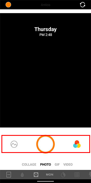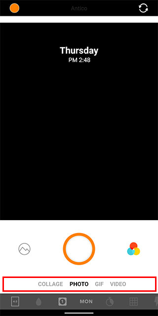 3、而工具栏上方是相机拍摄类型从左到右分别是拼贴连拍、相机、gif、录像