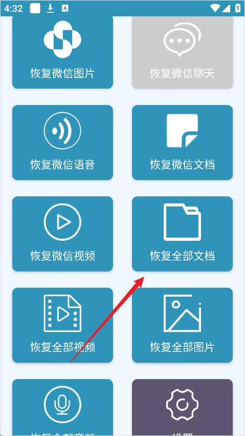 1、打开手机照片恢复还原软件后,在主界面中选择“恢复全部文档”功能