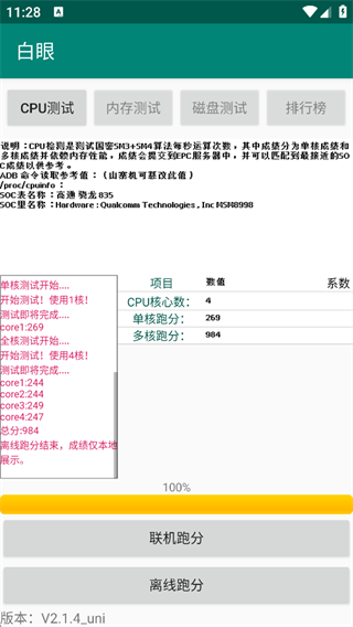 离线跑分:本地检测手机的多核数量及单核、多核的跑分成绩。