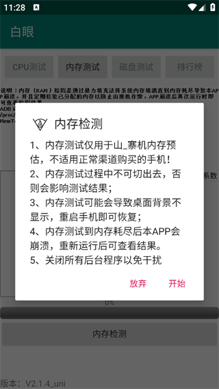 该功能通过暴力填充的方式测试手机的实际内存,直到App闪退为止。完成后,重新打开白眼App,即可查看手机的真实内存数据。注意:使用时需要耐心等待,测试完成后会有提示。