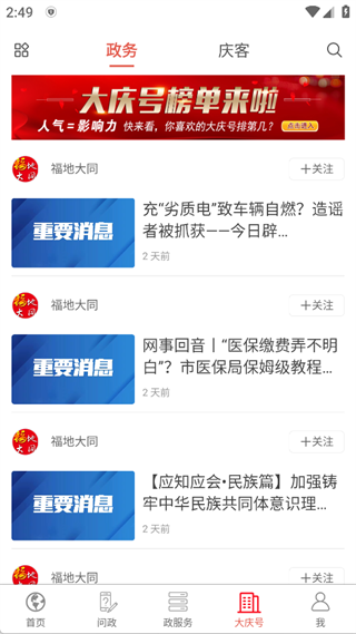 4、大庆号,融合多个自媒体平台,展现例如公安局、卫健委、气象局、医保局、体育局等相关信息,同时也展现了个人的文学、摄影的相关题材。
