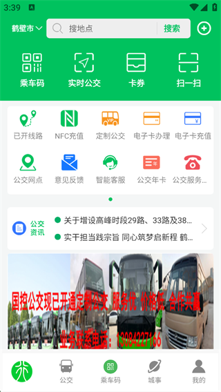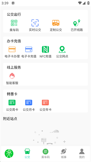 集合核心功能入口,涵盖 乘车码 、实时公交、卡券、NFC 充值等,还提供公交资讯,是用户获取公交服务和城市公交信息的主界面。