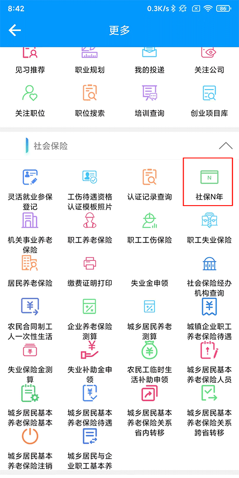 4、找到并打开社会 保险 下的社保N年,进入后输入相关个人姓名与社会保障卡号码,点击下方的确认即可。