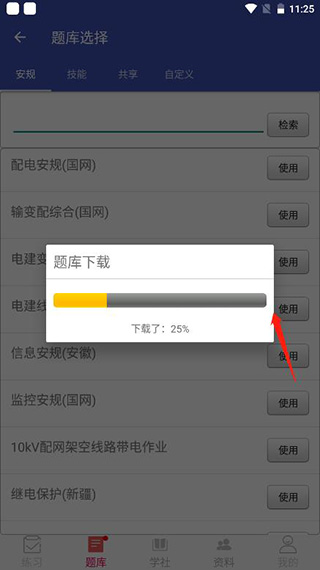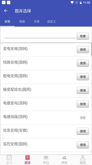 1、点击题库,这里带来了安规、技能、共享、自定义等分类,里面有各种题库;