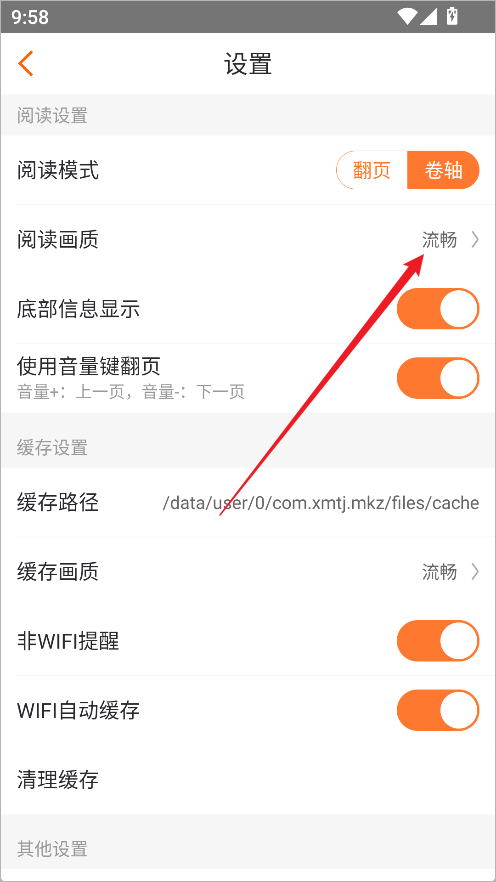 2、在设置菜单中找到“阅读画质”选项;