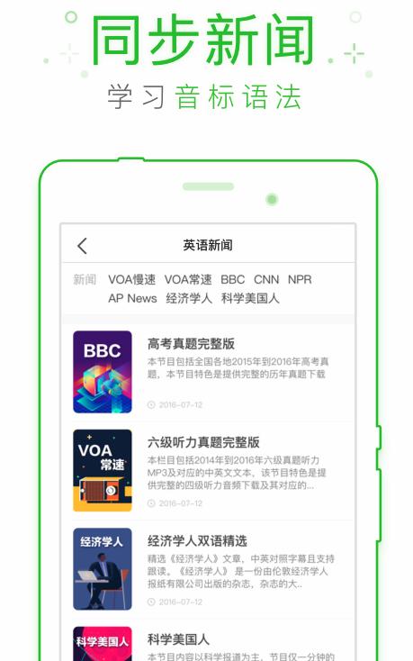 每日英语听力口语海量资源,天天更新:英语时事新闻、新概念英语、旅游英语、生活日常口语、商务英语流利说、各大考试英语(小学、初高中、四级六级、出国考试)、听歌学英语、美剧英剧电影学英语、趣配音学英语、英文杂志、英语播客、TED、VOA慢速、VOA常速、BBC、奥巴马演讲。双语美语,单词,英语广播,经济学家,NPR、CNN、AP News、科学美国人,EnglishPod、ESLPod、走遍美国、Listen To This、背诵为王、Step By Step、听说英国,疯狂英语,语法女王,名人演讲,出名。